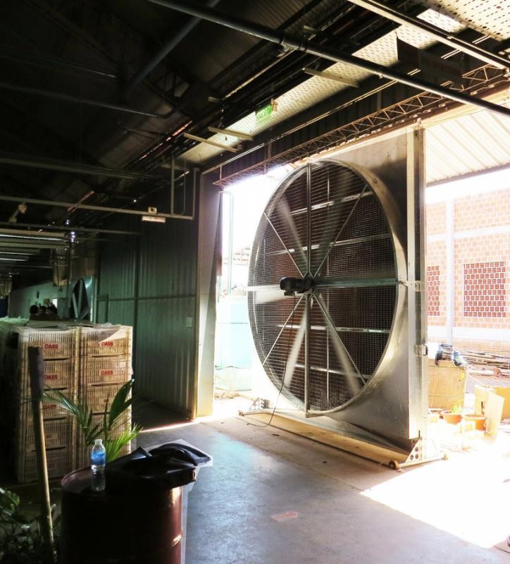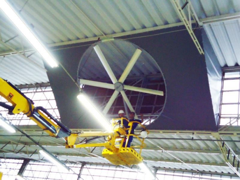 O climatizador evaporativo é um equipamento utilizado para redução da temperatura interna em grandes ambientes como: fábricas, indústrias, supermercados, escolas, centros de distribuição, entre outros. O funcionamento se dá a partir da evaporação da água. Ele é composto por um ventilador BigFan HVLS, painéis com placas de celulose e um tanque com água. A água é bombeada aos painéis fazendo passar através das placas de celulose continuamente. O ventilador força o passagem do ar através das placas de celulose. Com a passagem do ar pela placa, a umidade é evaporada e absorvida em pequena quantidade pelo ar, realizando assim, a redução da temperatura através do processo de evaporação. O climatizador evaporativo BigFan gera uma brisa uniforme em todas as direções, melhorando a sensação térmica e a produtividade, reduzindo o risco de acidentes, bem como afastando diversos gases e peiras existentes. A tecnologia HVLS (High Volume Low Speed) dos BigFans produz grandes vazões de ar com baixa velocidade e baixo nível de ruído.