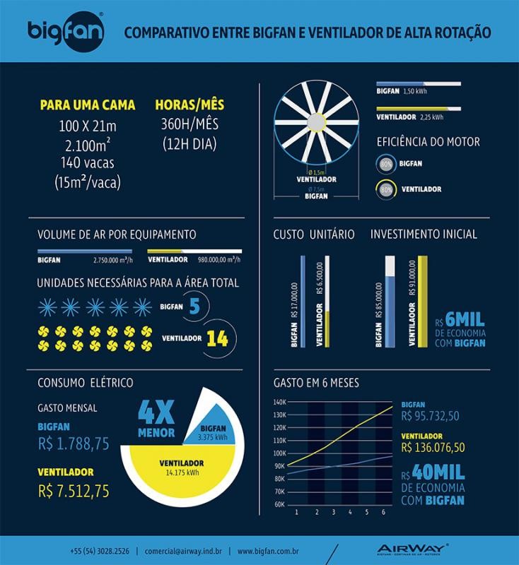 O ventilador free stall BigFan é o equipamento mais eficiente no mercado para a aplicação em sistemas de confinamento (free Stall), com apenas um BigFan você pode substituir de 4 a 6 ventiladores comuns de alta rotação. A grande economia é gerada através do seu sistema de funcionamento de baixa rotação, controlado através de inversor de freqüência e motoredutor. Todo o ventilador free stall BigFan é equipado com esses componentes. Com apenas um BigFan de Ø5,5m com 2cv de potência, em funcionamento de 12 horas ao dia com o custo de R$ 0,50/kW.h, a conta mensal de energia será de R$ 337,50. Se compararmos o ventilador BigFan à 4 ventiladores comuns de alta rotação nas mesmas condições, em 12 horas de funcionamento ao dia, iremos obter um custo de operação de R$ 1.980,00 ao mês, uma grande diferença de R$ 1.642,50 ao mês ou o valor de: R$ 19.710,00 no ano!! Valor que sairia do seu bolso!!